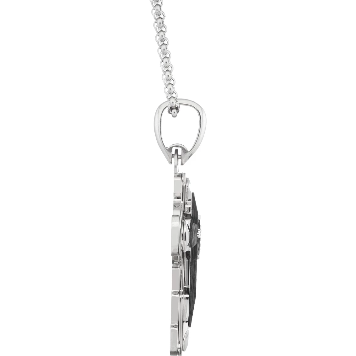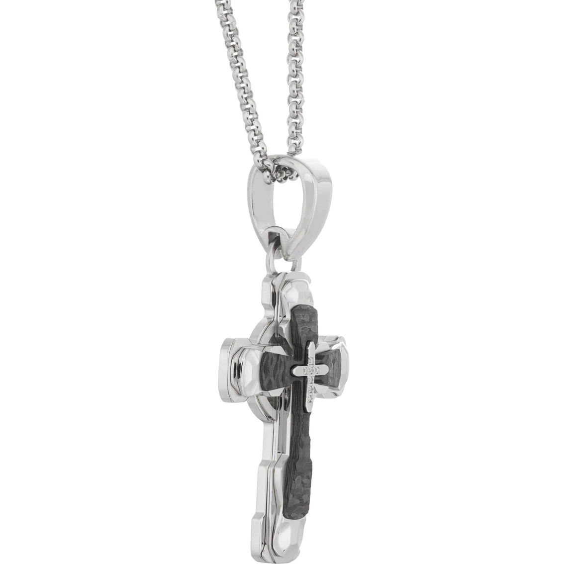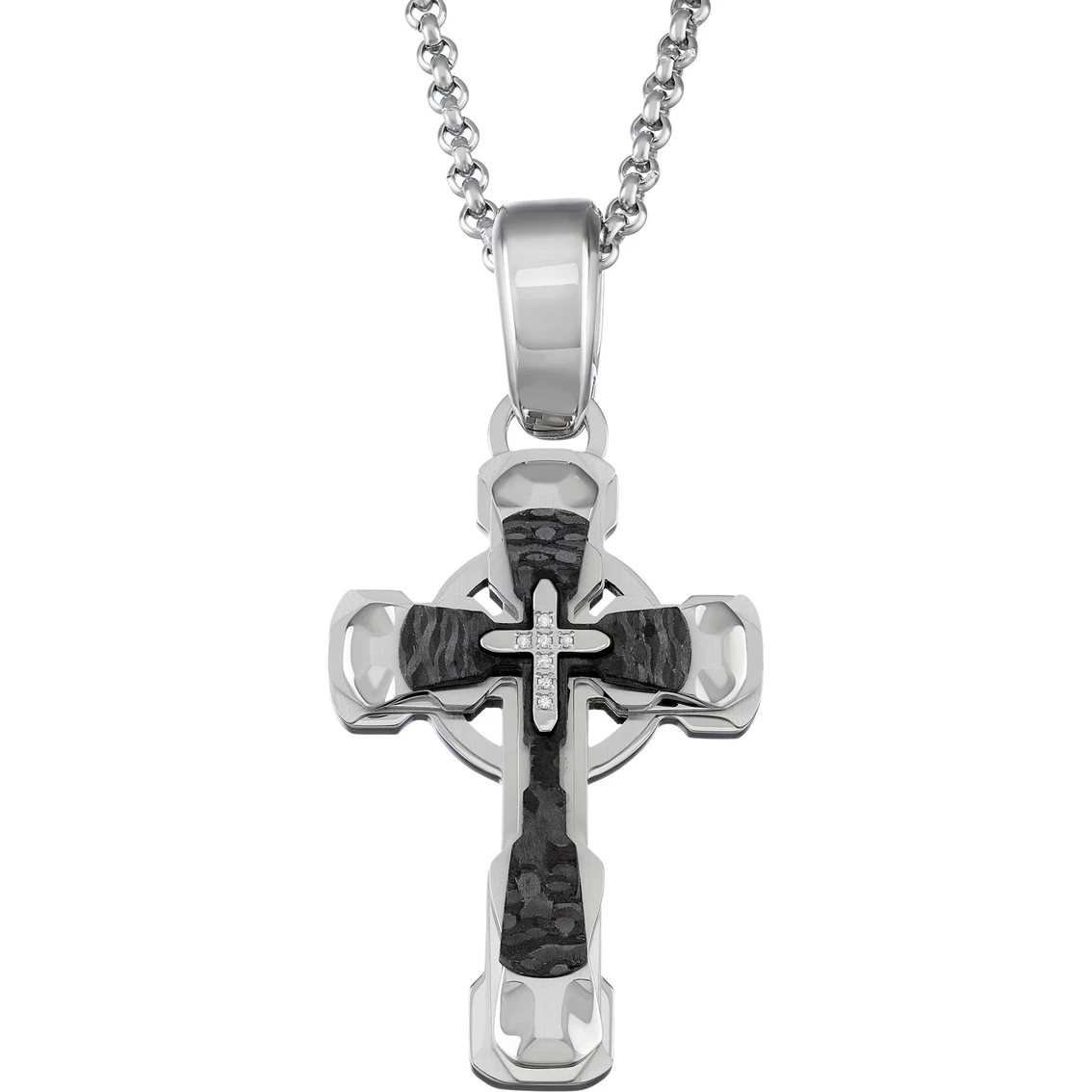 This Celtic-style men’s cross from Black & Blue Jewelry is machined from solid high-end stainless steel and solid carbon fiber. Specially designed tools are used to carve the solid carbon fiber which leaves an iridescent woodgrain effect behind. Accented with seven diamonds. Medium size cross pendant Includes a 24 inch chain. Style: CS442.