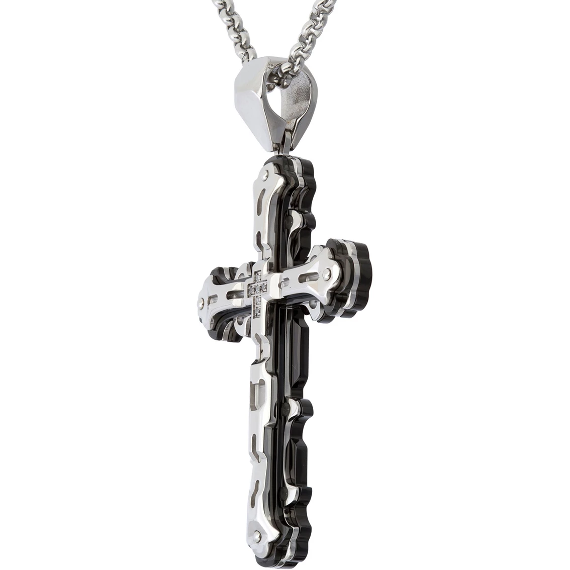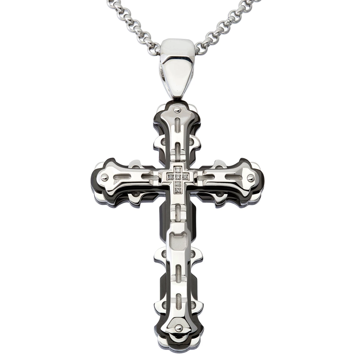 Express yourself with this large two-tone, machined steel and diamond cross pendant from Black & Blue Jewelry. Style: CS375A.