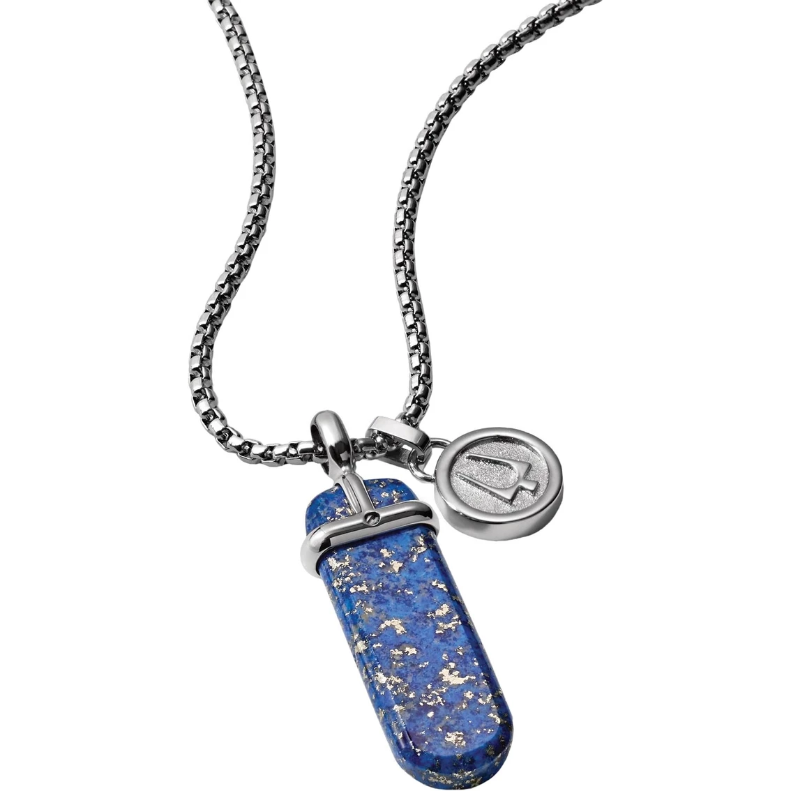 This men’s necklace features a polished pendant of semi-precious lapis — believed to stimulate self-awareness, creativity and clarity — set in stainless steel and presented on a round box link chain accented by a removable signature Bulova tuning fork charm. Stainless steel chain adjusts from 26 in. to 28 in. with extender ring, and signature tuning fork closure. Pendant measures 1.4 x 0.5 x 0.17 in. Style: J96N008.