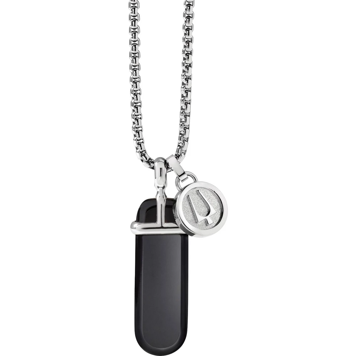 From the Classic Collection, this men’s necklace with semi-precious black onyx pendant has the signature Bulova tuning fork charm set in stainless steel. Black onyx is believed to aid the development of physical strength and stamina and is a powerful protection stone. One size fits all. The round box link chain that is adjustable from 26 in. to 28 in. and secures with a Signature lobster claw closure. Pendant dimensions: 36mm x 12mm x 4.2mm. Style: J96N007.