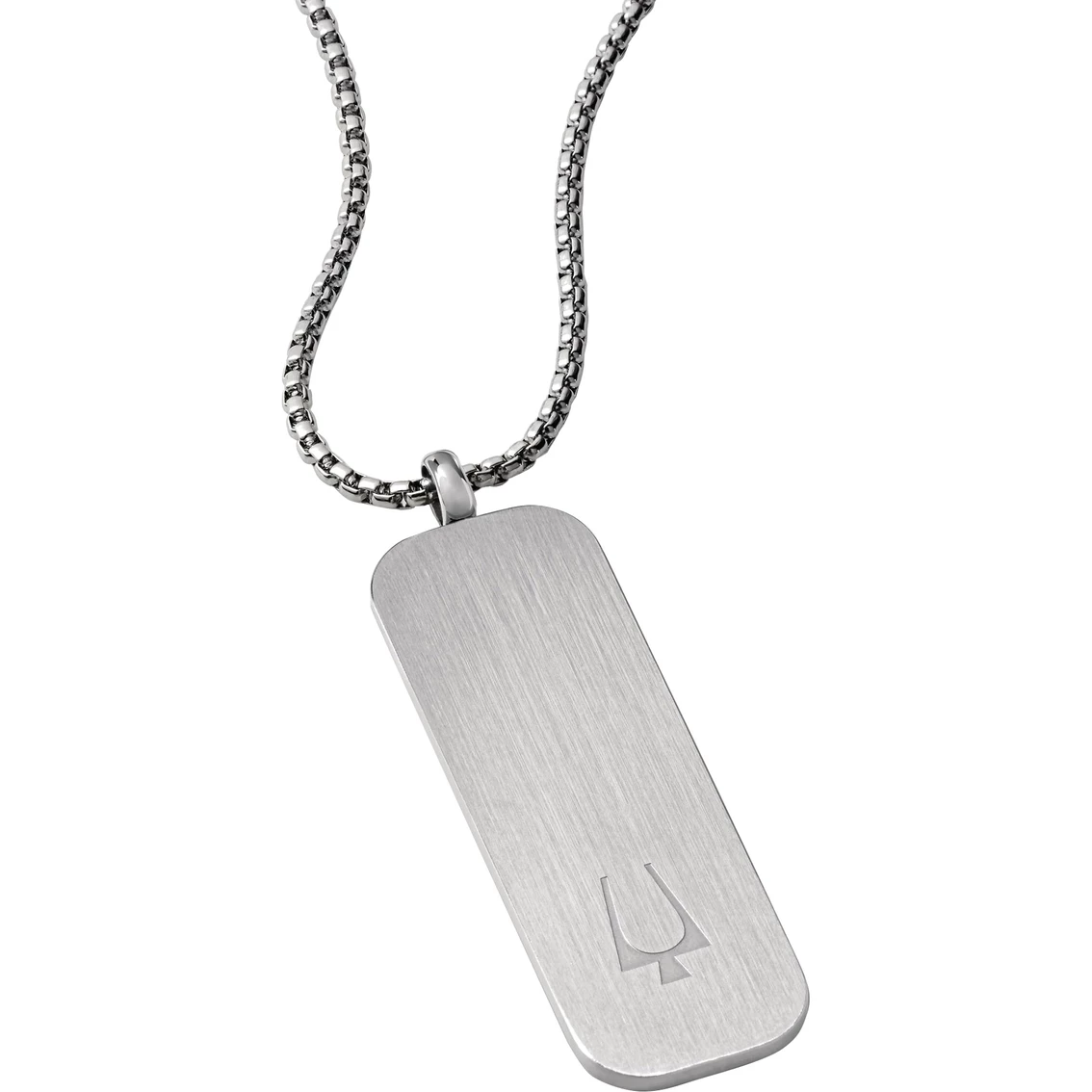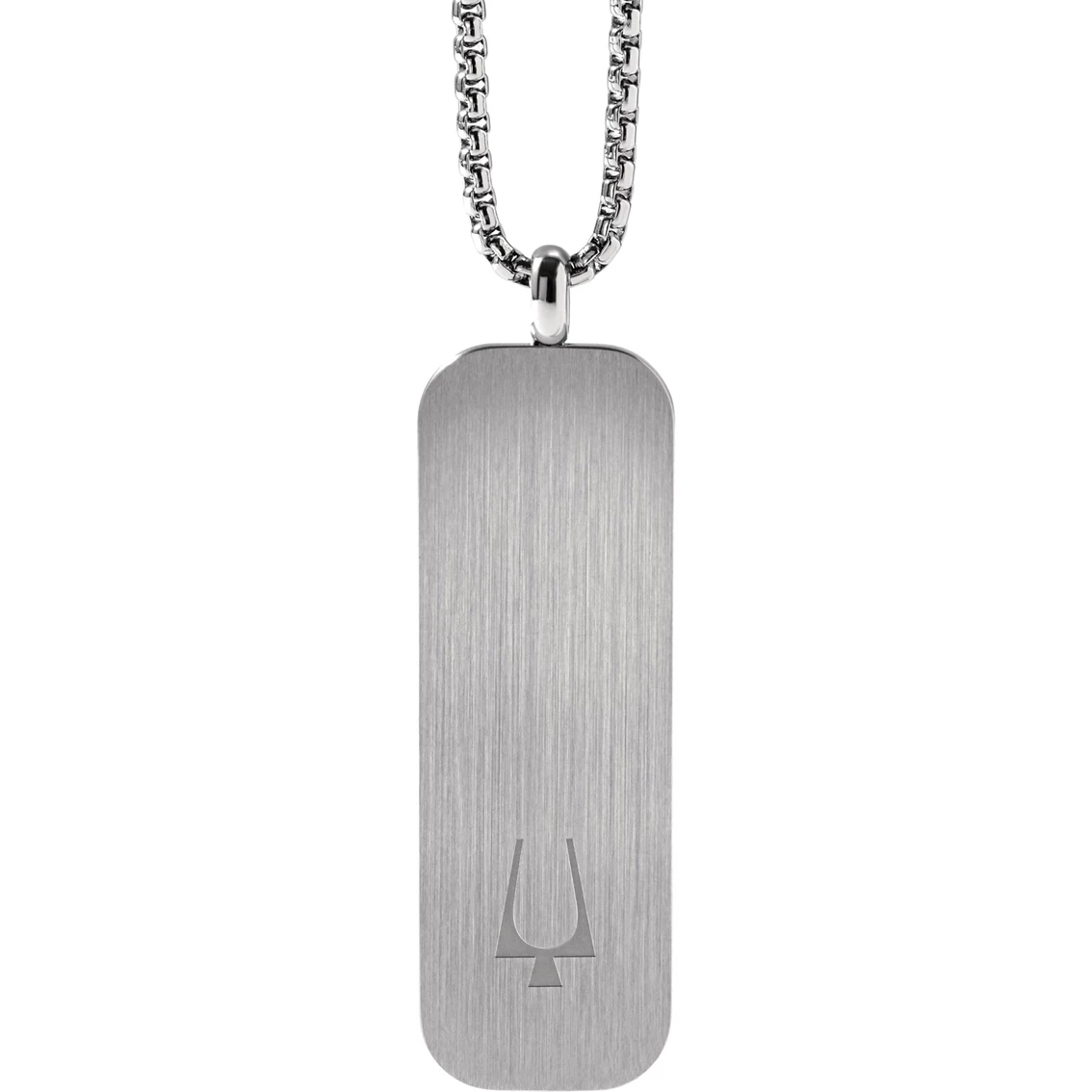 This model men’s necklace features a stainless steel dog tag pendant engraved with the Bulova logo on one side and signature tuning fork on the other — a classic layering piece. The round box link stainless steel chain adjusts from 26 in. to 28 in. with extender ring and secures with a signature tuning fork closure. Pendant measures 2.2 x 0.8 x 0.08 in. Style: J96N009.