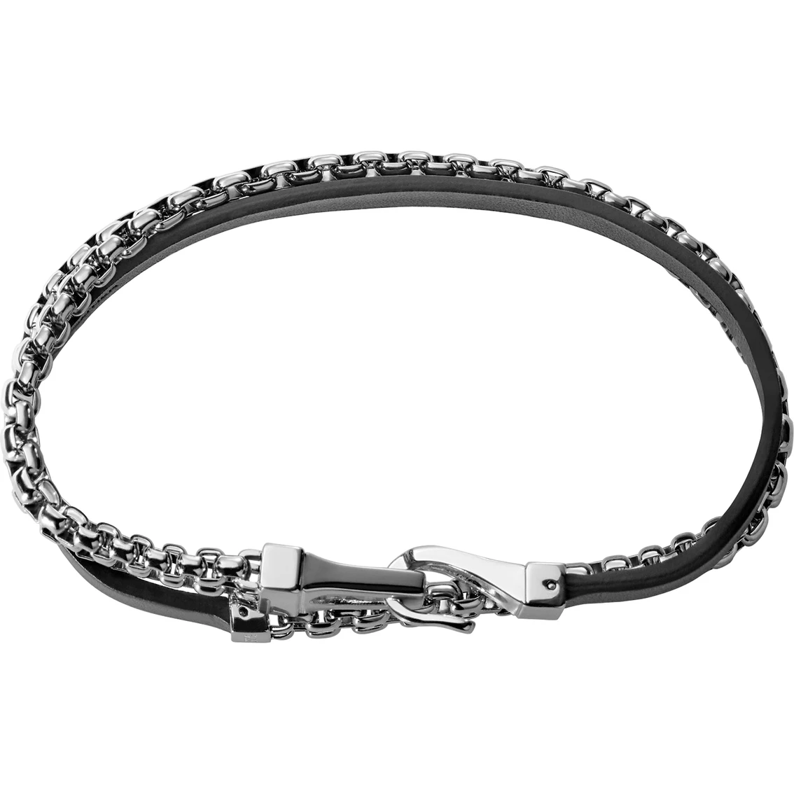 Supple black leather and brushed stainless steel double-wrap bracelet with round box-link double chain for an instant layered look. Available in size Medium (J96B015M: Fitting wrist size 7″-7.5″) or Large (J96B015L: Fitting wrist size 7.5″-8″).