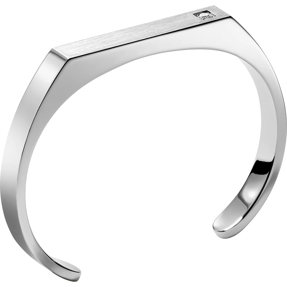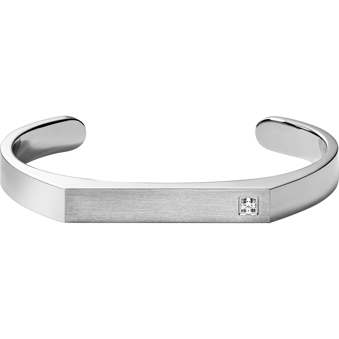 Sleek open cuff bracelet, perfect for layering. Clean sculptural lines crafted in solid stainless steel, with the flat brushed top surface detailed by a single 3.0mm (0.10 CT) full cut diamond. Available in size Small (J96B013S: Fitting wrist size 6″-6.5″), Medium (J96B013M: Fitting wrist size 6.5″-7″) or Large (J96B013L: Fitting wrist size 7″-7.75″).