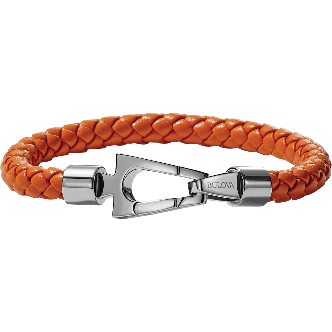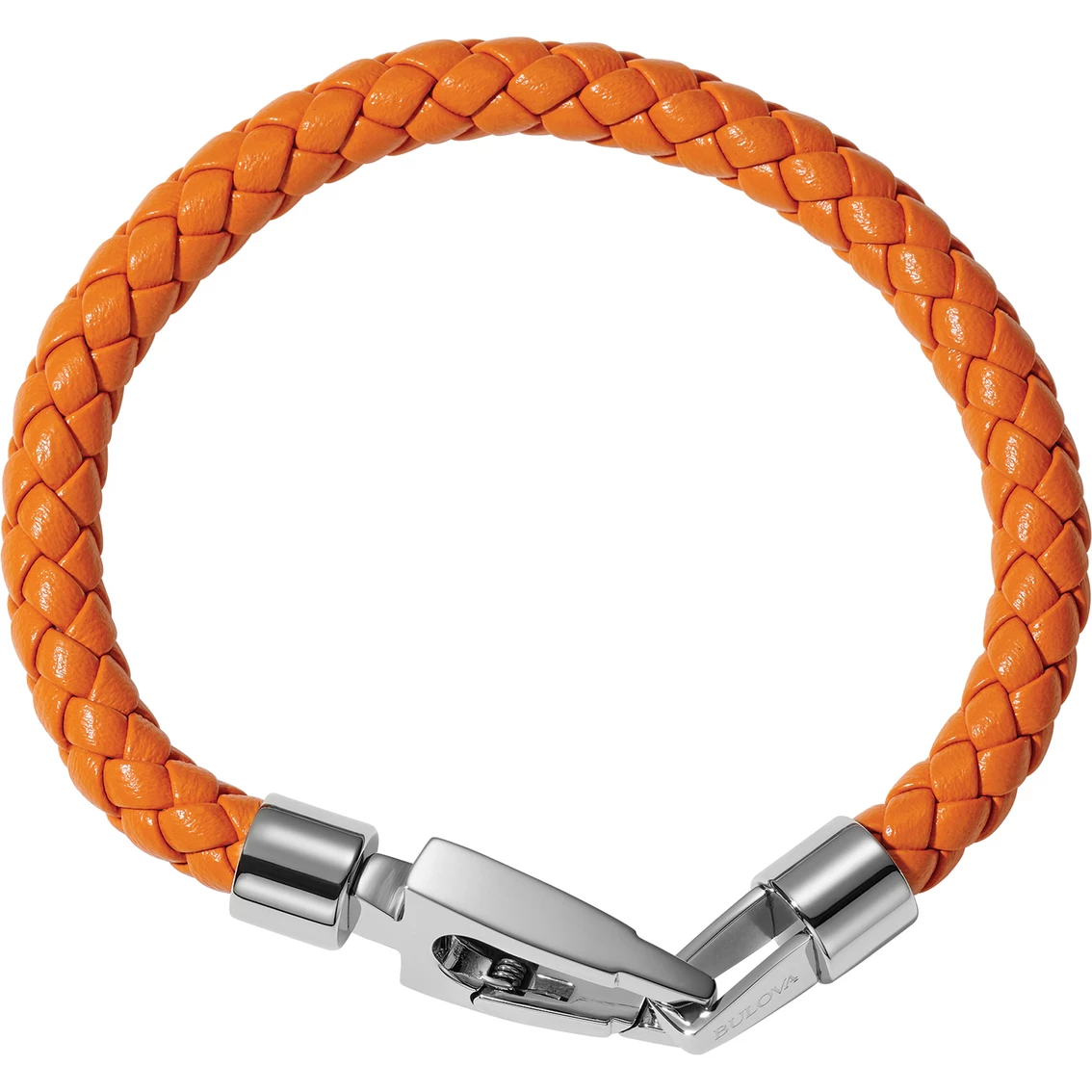 The model J96B027 Bulova men’s bracelet features an orange braided leather bracelet and silvertone stainless steel clasp. Inspired by nautical ropes and color codes, this braided leather bracelet in fresh orange offers endless layering possibilities. The bracelet is anchored by a stainless steel signature tuning fork clasp. Available in size Medium (J96B027M: Fitting wrist size 7-7.5 in.) or Large (J96B027L: Fitting wrist size 7.5-8 in.). Style: J96B027.