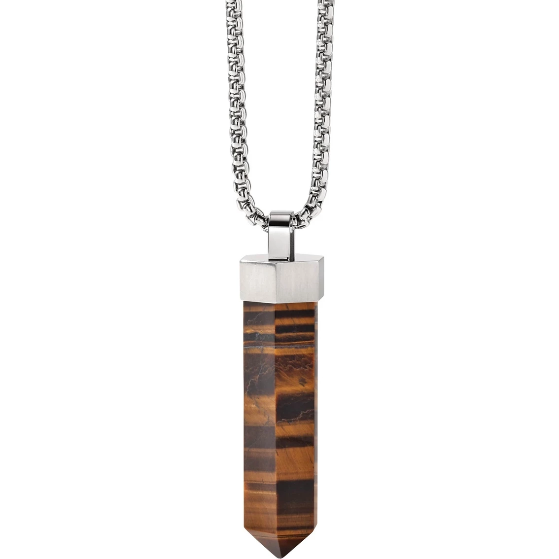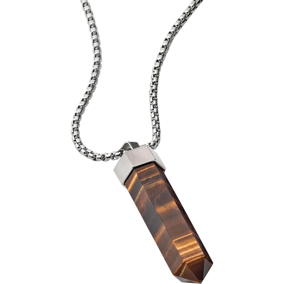 This Bulova men’s necklace features a tiger’s eye obelisk-shaped pendant suspended from an iconic Precisionist bolt design setting in stainless steel. Tiger’s Eye is a semi-precious gemstone believed to bring good luck and prosperity. Round box link stainless steel chain with extender ring adjusts from 26 in. to 28 in. Pendant measures 1.7 x 0.4 x 0.4 in. Style: J96N005.
