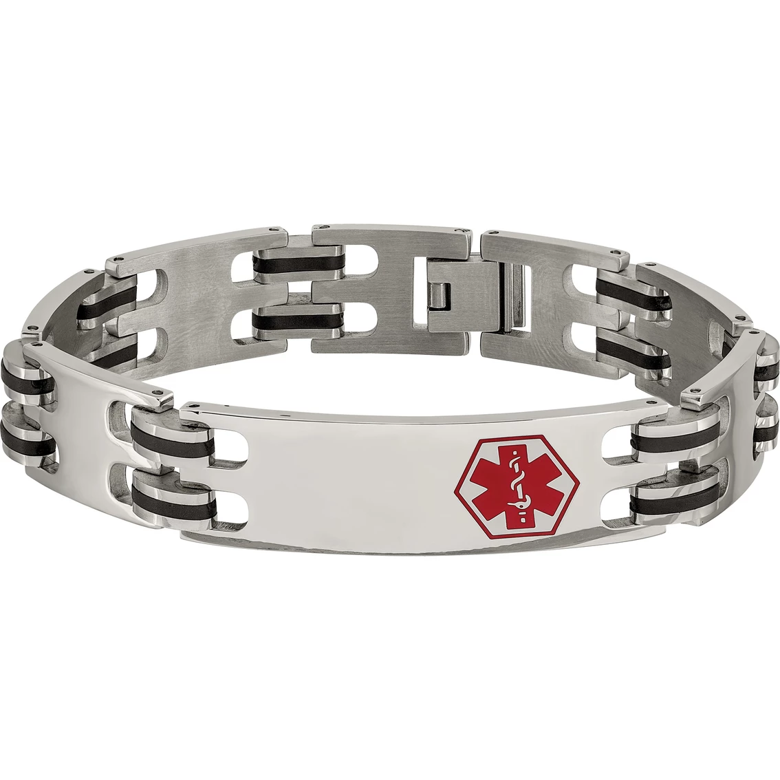 This medical bracelet is crafted from stainless steel and black rubber. This engravable, 8.25 in. long and 12mm wide medical bracelet features black rubber pattern and red enameled medical logo with a fold-over catch closure. It also has a high-polished finish for an everlasting shine that will never go dull. Wrap your wrist in style with this medical bracelet.