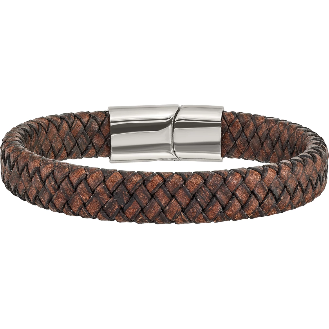 Refine the look of any outfit with this handsome leather bracelet from Chisel. This 8.5-in. long and 11.8mm wide masculine bracelet features braided brown leather with stainless steel magnetic clasp. Modern yet stylish, this bracelet is great to make a stunning fashion statement. Style: SRB2415.