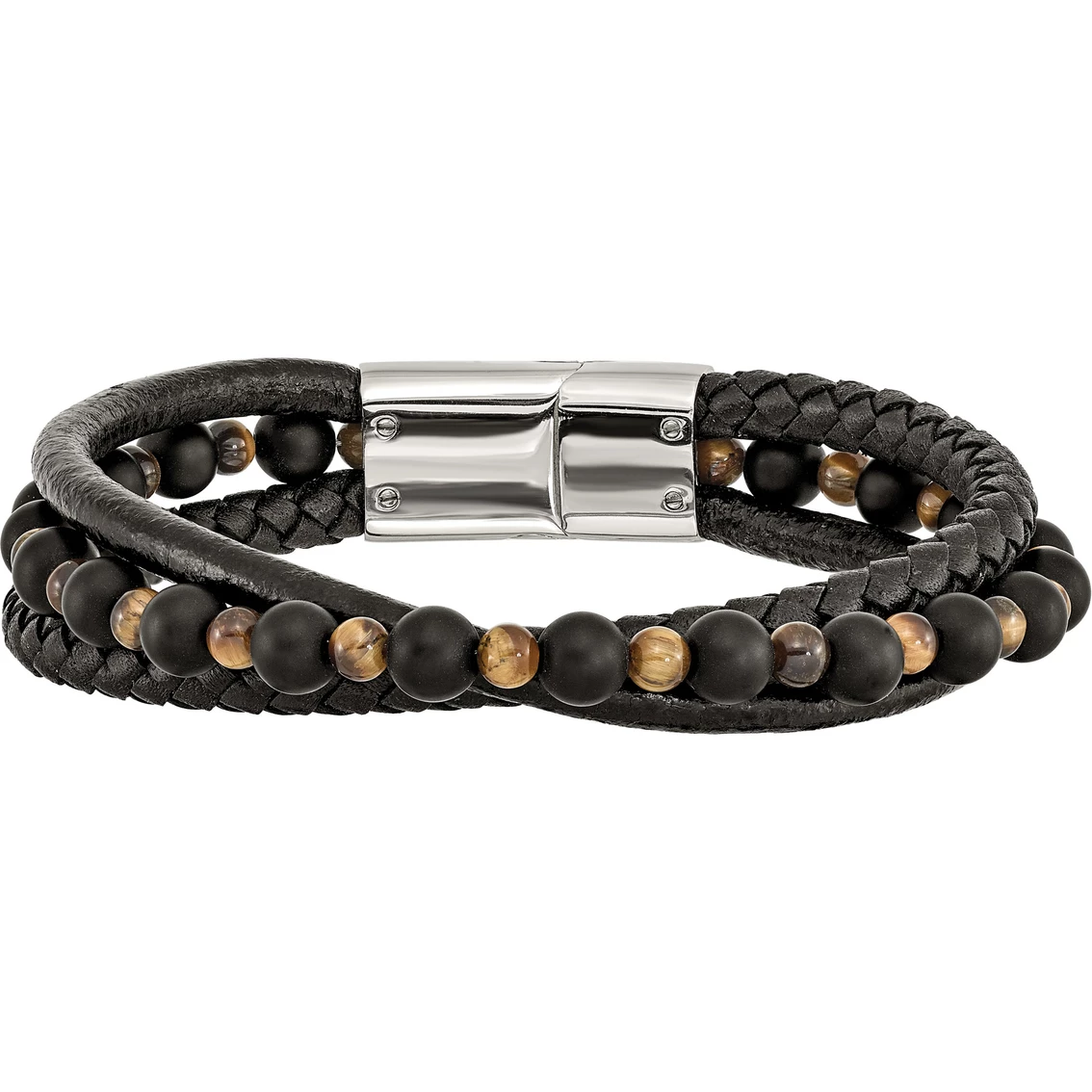 Add a new element to your outfit with this handsome men’s bracelet from Chisel. This black leather and stainless steel bracelet features multi-strands with agate and tiger’s eye beads to give it a dashing look. This 8.25-in. long and 15mm wide bracelet secures with a magnetic closure. Style: SRB2464-8.25.
