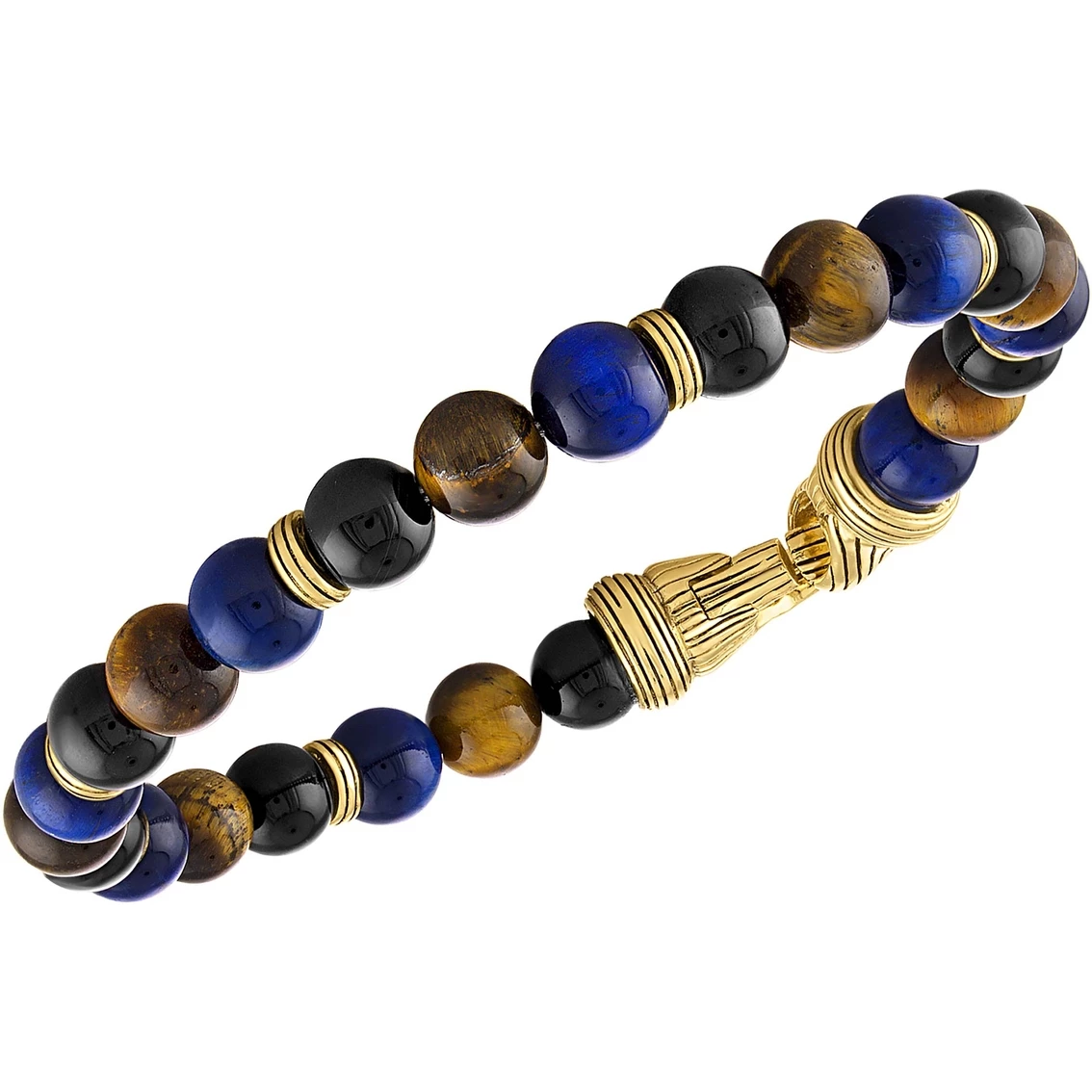 Polished beads of brown tiger eye, blue tiger eye, and black agate are enhanced by goldtone accents on this men’s bracelet from Esquire Men’s Jewelry. Style: ESB1403-YSMULAA.