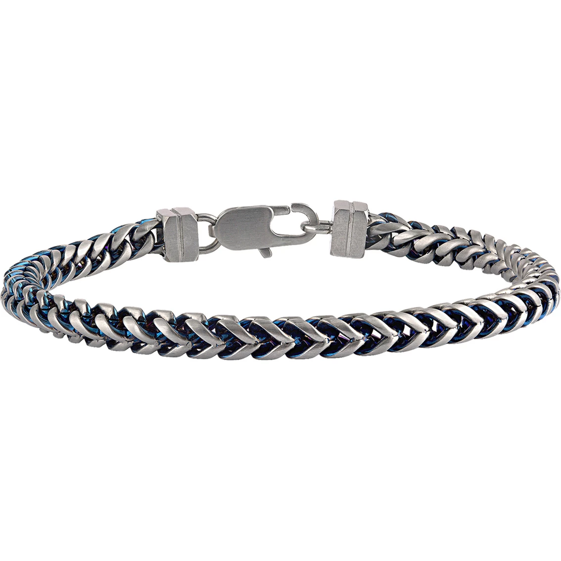 This unique link chain men’s bracelet from Esquire features blue ion plating visible from only certain angles to add depth and intrigue. This men’s stainless steel bracelet is approximately 8.5 in. long and secures with a lobster clasp. Style: EZB1063-SLSTNAME.