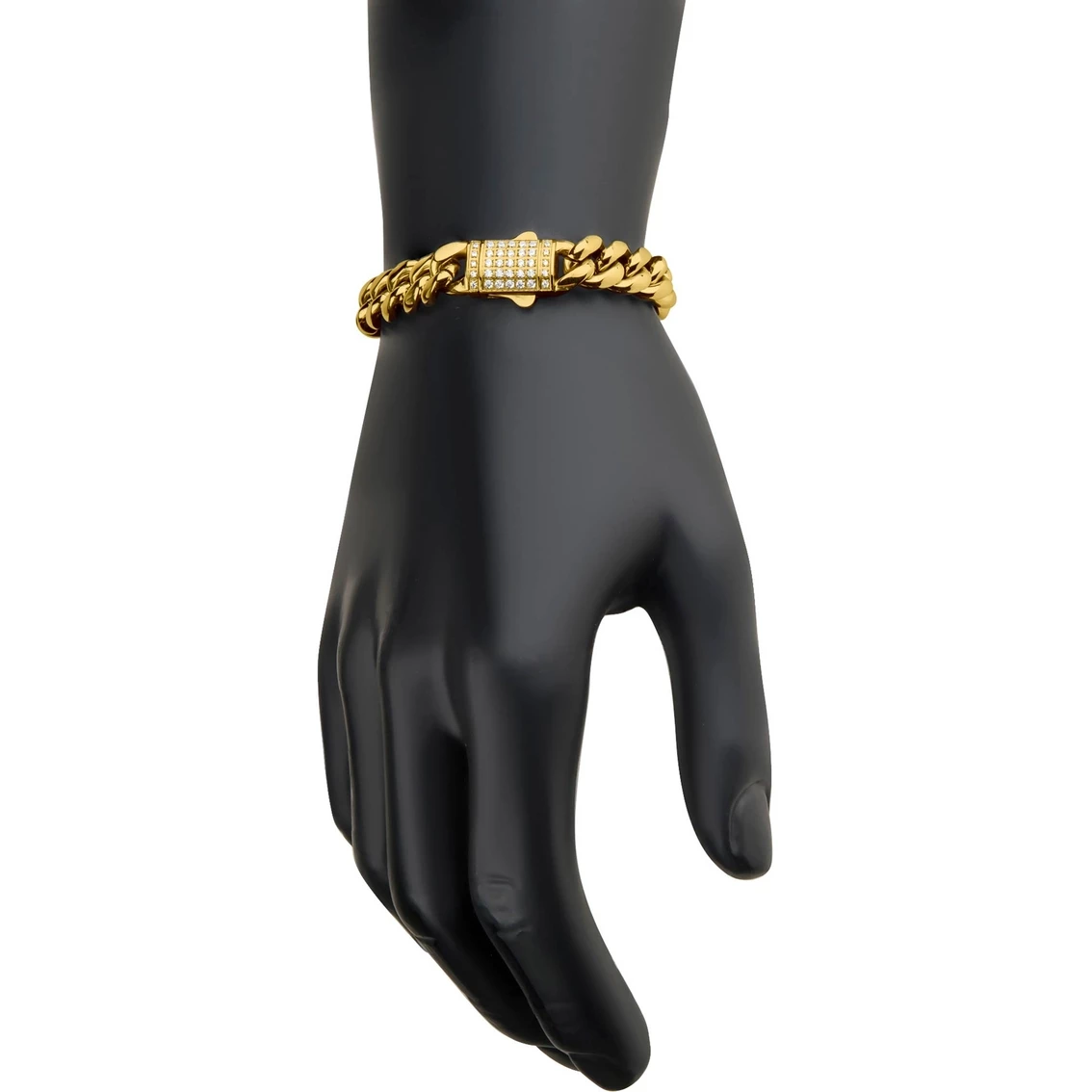 Spruce up your suit or jeans with the INOX 18K Goldtone Miami Cuban Chain Bracelet with Cubic Zirconia. This bracelet is made with CNC precision. Complete with a double tab box clasp. Style: NSTC2110-85GP.