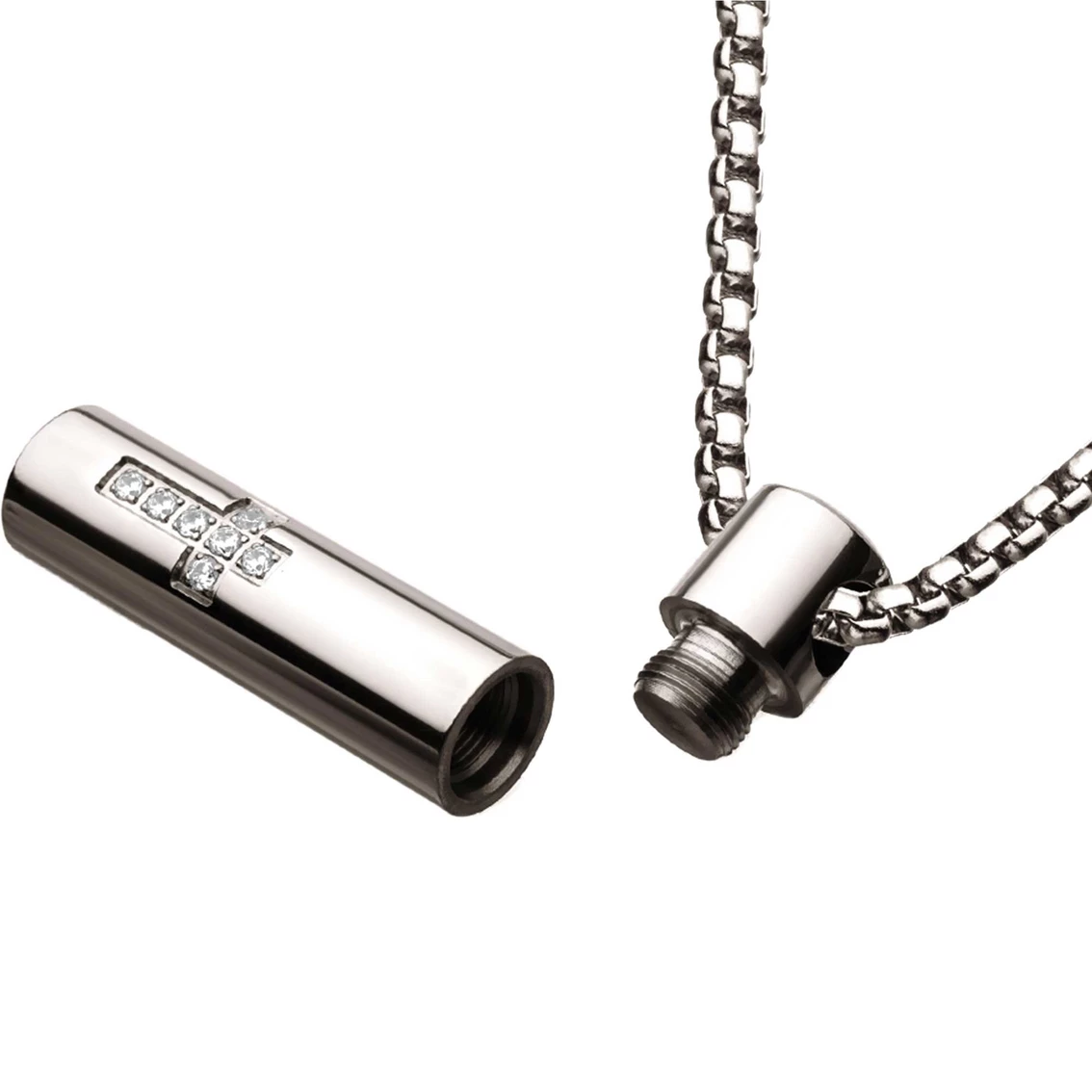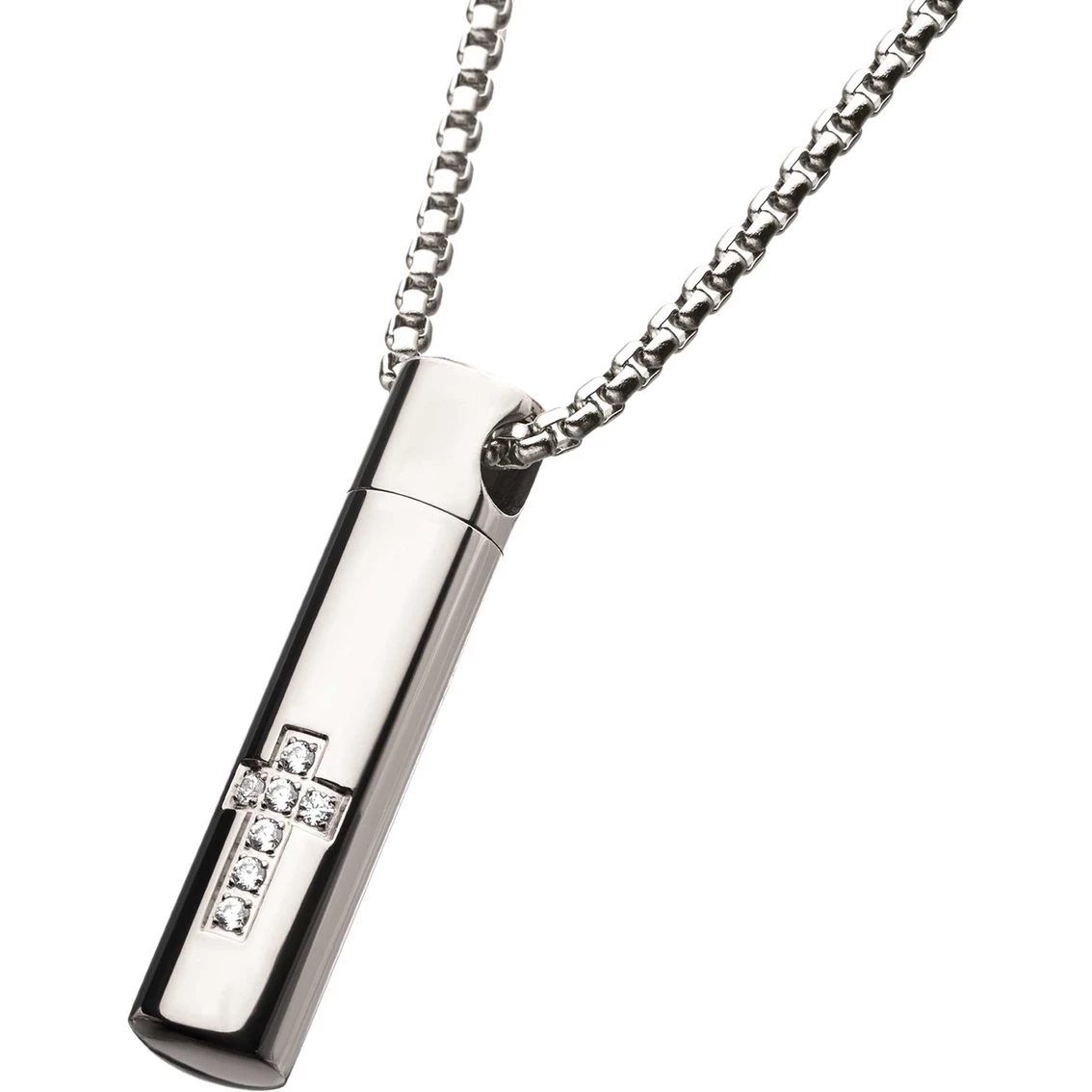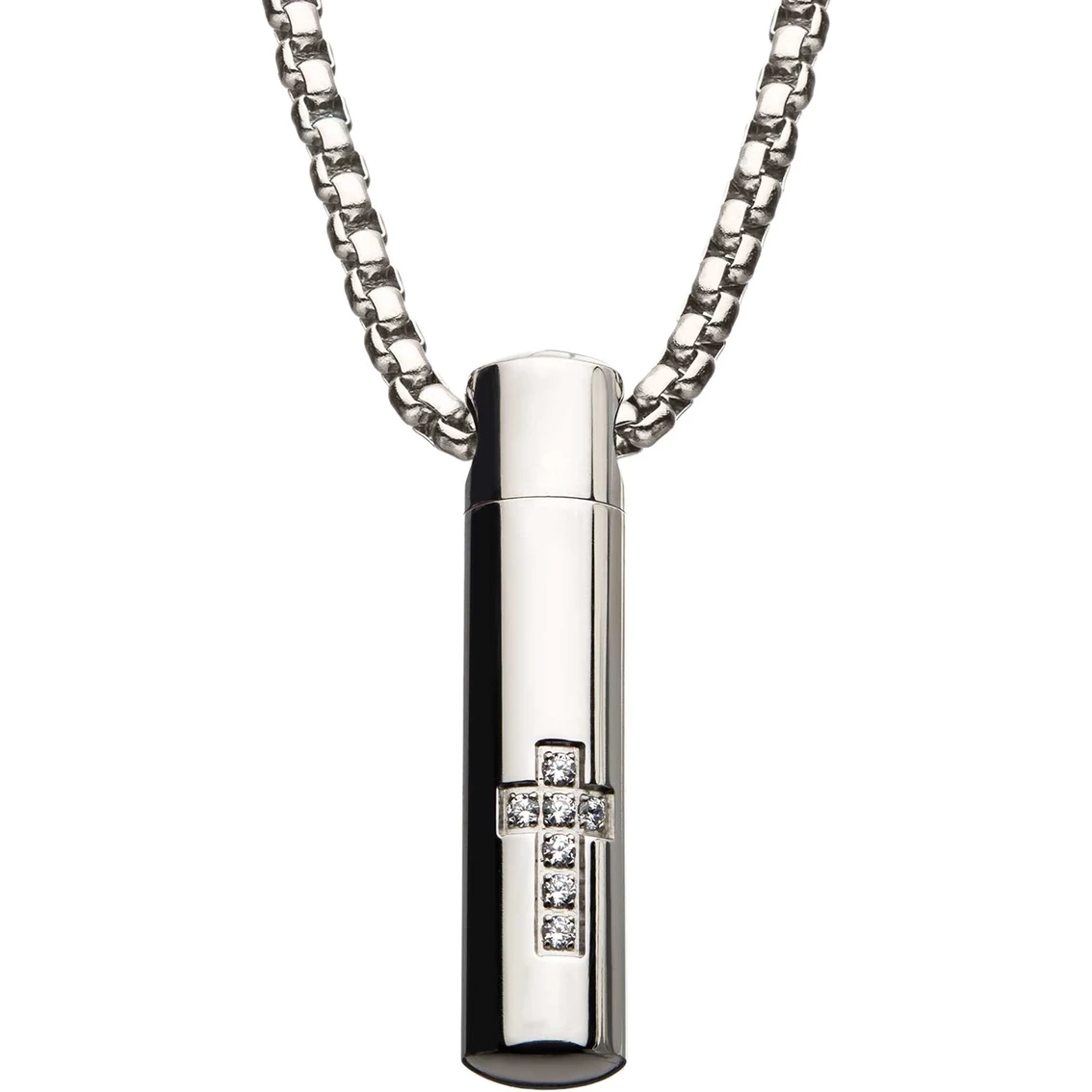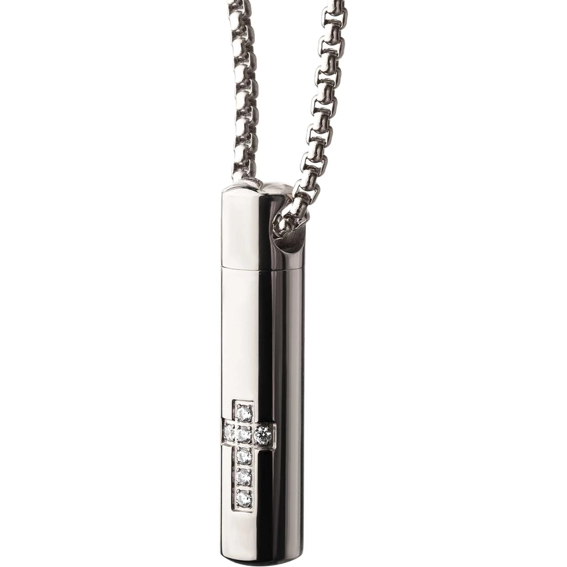 A bit of mystery is evoked in this Men’s Stainless Steel Memorial Cross Pendant with Clear CZ & Steel Box Chain. What do you plan to carry around with you in its tiny container? Style: SSP22210NK.