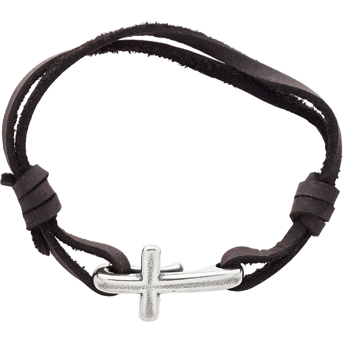 A rugged symbol of faith, this design features a bronze or sterling silver cross clasp that is complemented by a hand-knotted brown or black leather cord.
