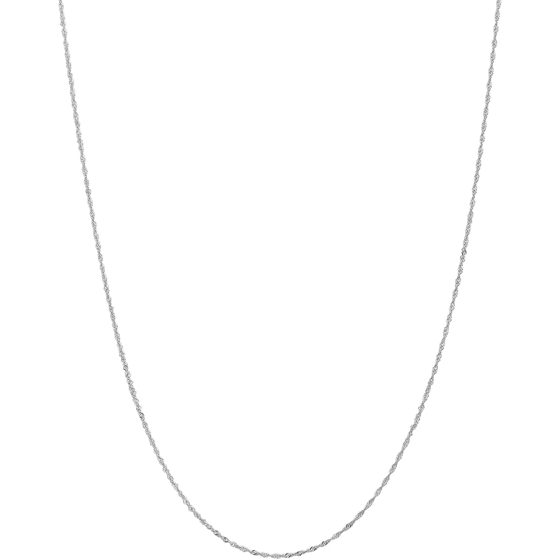 14K White Gold 1.10mm Singapore Chain. Ideal for any occasion day or night this 14k white gold rhodium plated Singapore chain necklace is sure to impress. This 1.10mm wide solid necklace features diamond cut and high polished finish for striking shine and protects with spring ring clasp. This charming Singapore chain necklace makes a classic fashion statement that’s perfect for year-round wear. Style: PEN167-18.
