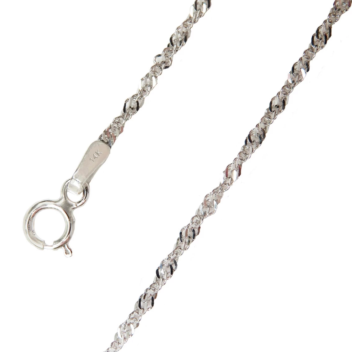 The natural curve of the link provides the look of liquid gold in this Solid 14K White Gold 1.8mm Singapore Chain. Wear it alone, layered or with a pendant or charm. Chain secures with a spring ring closure. Various lengths available. Style: W-SING 030.