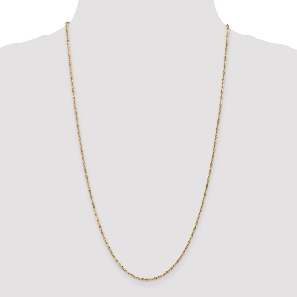 Ideal for any occasion day or night, this 14K yellow gold Singapore chain necklace is sure to impress. This 1.40mm wide solid necklace features a high polished finish for striking shine. It secures with a spring ring clasp closure. This charming Singapore chain necklace makes a classic fashion statement that’s perfect for year-round wear. Style: PEN52.