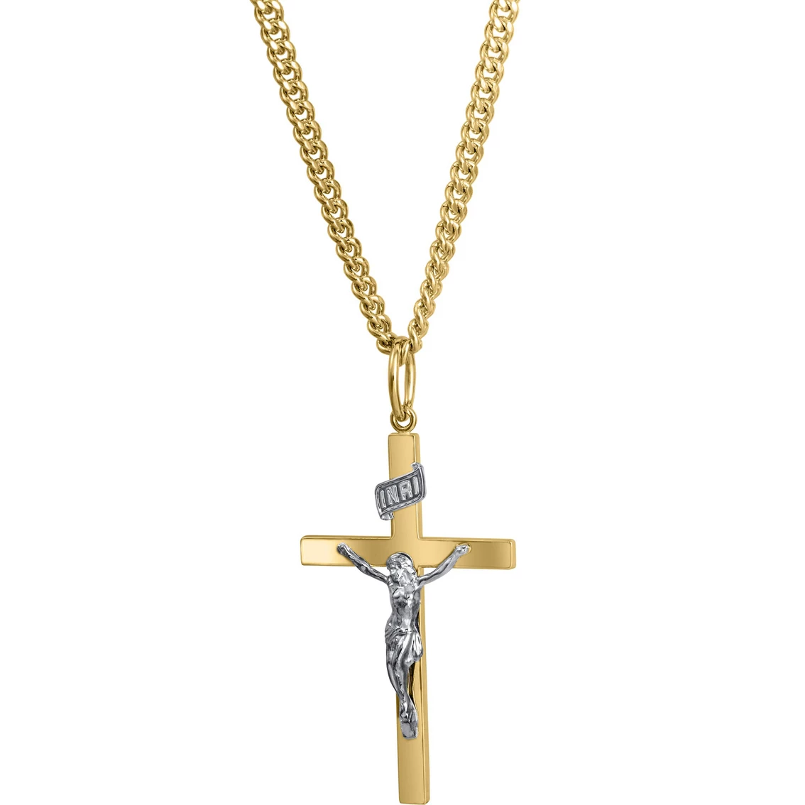 He will love this 14K yellow gold-filled and stainless steel crucifix cross pendant. It is solid and features a 24-in. stainless steel chain. A gift box is included. Style: C159AA.