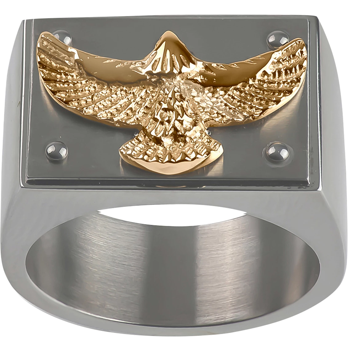 This handsome two-tone ring features a flying eagle in yellow gold ion plating set on a high polished rectangle top with bolts at each corner. Measuring 0.5 in. wide, this stunning ring is crafted from the finest 316L stainless steel, resisting corrosion, scratches and tarnishing. Style: 4R22628-ST.
