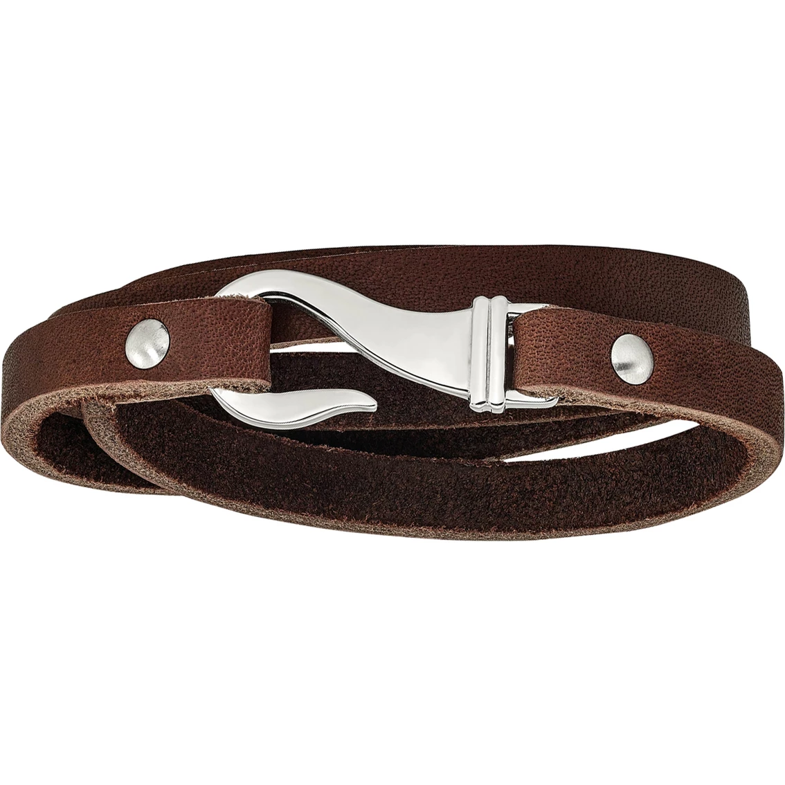 Wear this stylish leather wrap bracelet to add a simple decorative touch to your outfit. This 24-in. long and 7mm wide adjustable bracelet features a brown leather strap with a stainless steel hook closure that makes it simple to put on and take off. Shining with a high polished finish, this bracelet is great for those men who prefer a modern yet classy look. Style: SRB528-24.
