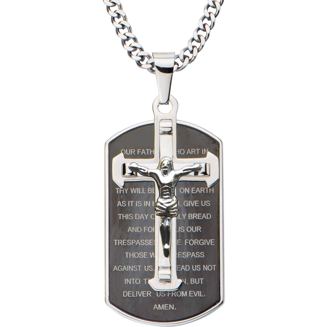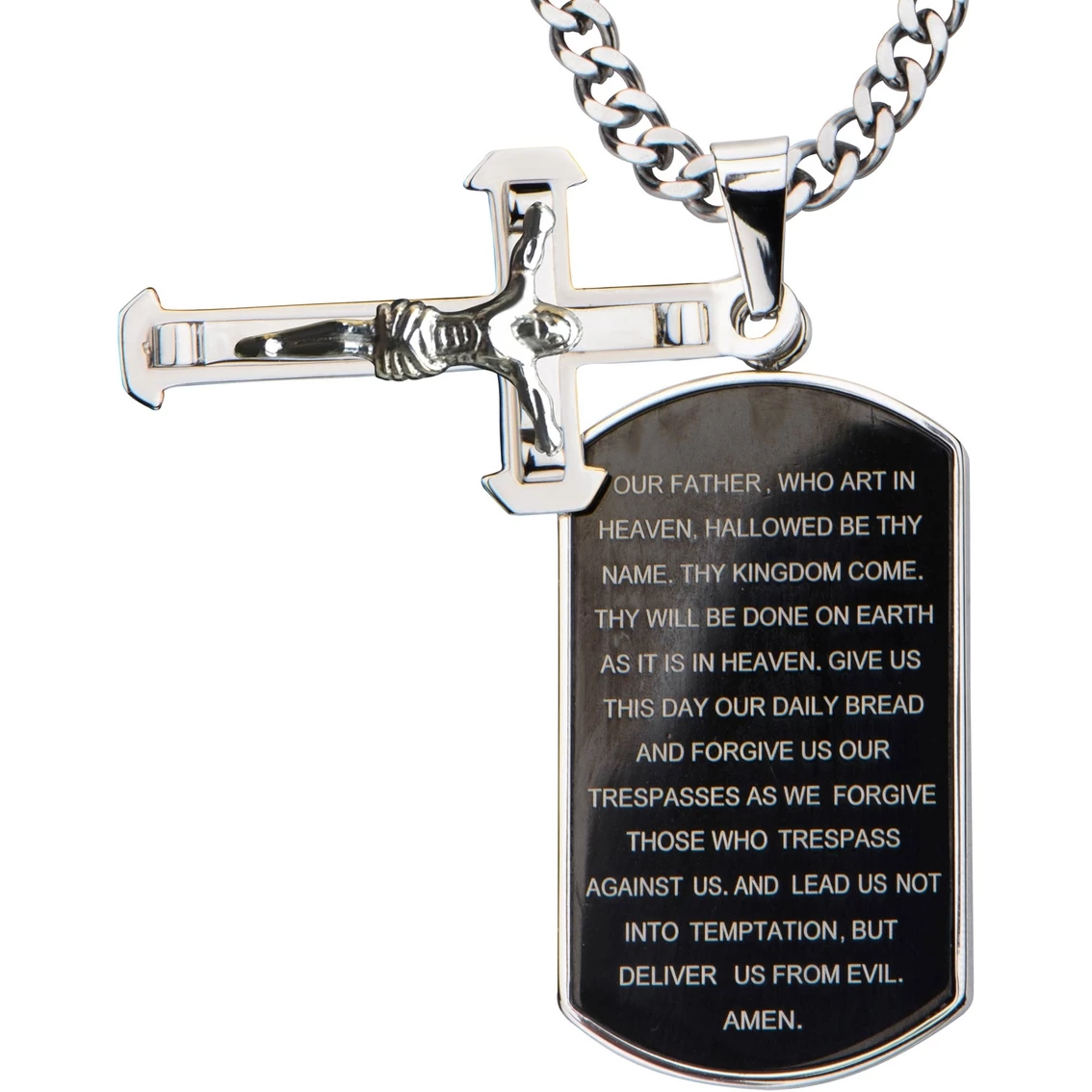 Honor your faith with this dog-tag-and-cross Lord’s Prayer Pendant crafted in polished stainless steel with a full lettering of the The Lord’s Prayer. Style: SSP6973NK.