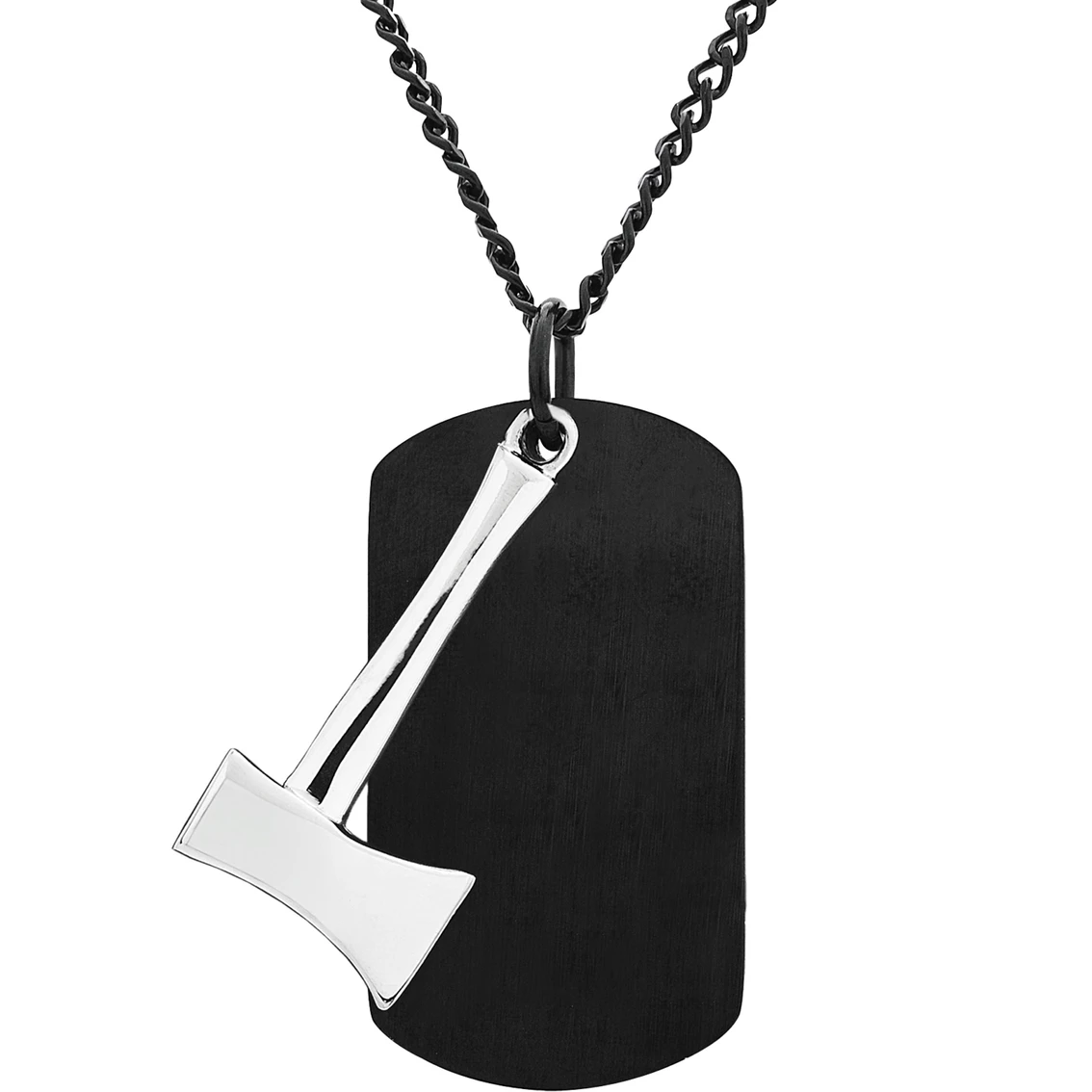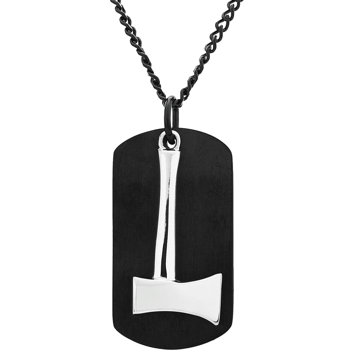 Stainless Steel Dog Tag Hatchet Pendant. This handsome 2-piece pendant features a black ion plated dog tag pendant and a bright bold hatchet shaped pendant joined and laying on top for a stunning look. Crafted from the finest 316L stainless steel with a high polished finish, it resists corrosion, scratches, and tarnishing. The pendant measures about 1.75 in. long by 1 in. wide and hangs from a 24 in. stainless steel 3mm curb chain with secure lobster clasp. Style: NK15318-STBK 24.