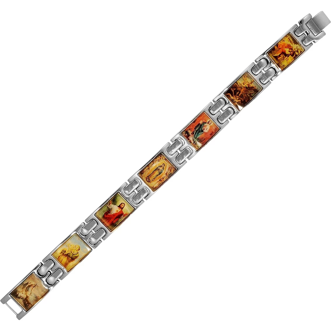 This magnificent bracelet will be a conversation piece. Featuring different religious images within rectangular shaped links, all brilliant in multi-colored enamel. Measures 8.25 in. long by 14mm wide and closes with a secure fold-over clasp. Crafted with the finest 316L grade stainless steel, this beautiful bracelet resists corrosion, scratches and tarnishing. Simply wipe with a soft cloth to maintain luster. Style: CB11653.ML8.