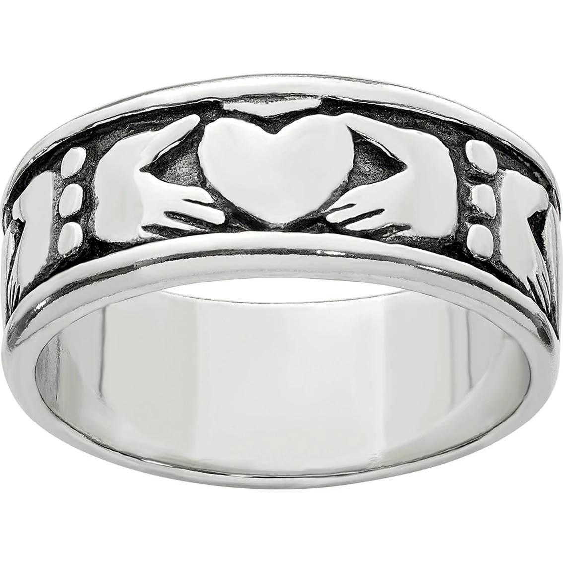 Celebrate love, friendship, and loyalty with this Sterling Silver Claddagh Design Ring. Showcasing two hands holding heart design in antiqued background, this 8mm wide ring offers rustic look to your style. With a high polished finish, this enchanting ring boasts lasting shine and comes in whole finger size 10. Special sizes are available upon request. Visit a store or contact customer service for details Special orders may take longer to ship. Style: QR1951-10.