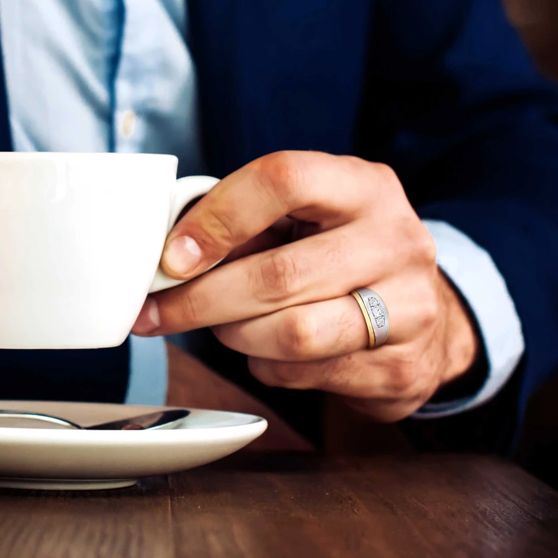 This marvelous textured 3-stone men’s wedding band by Sofia B. is crafted in two-tone white and yellow gold and features three round-cut, prong-set created white sapphire gemstones with 5/8 ct. TGW studded at the center of the ring. Polished to a brilliant shine, this alluring wedding ring is a valuable addition to any jewelry collection. Style: AFS007004/size.